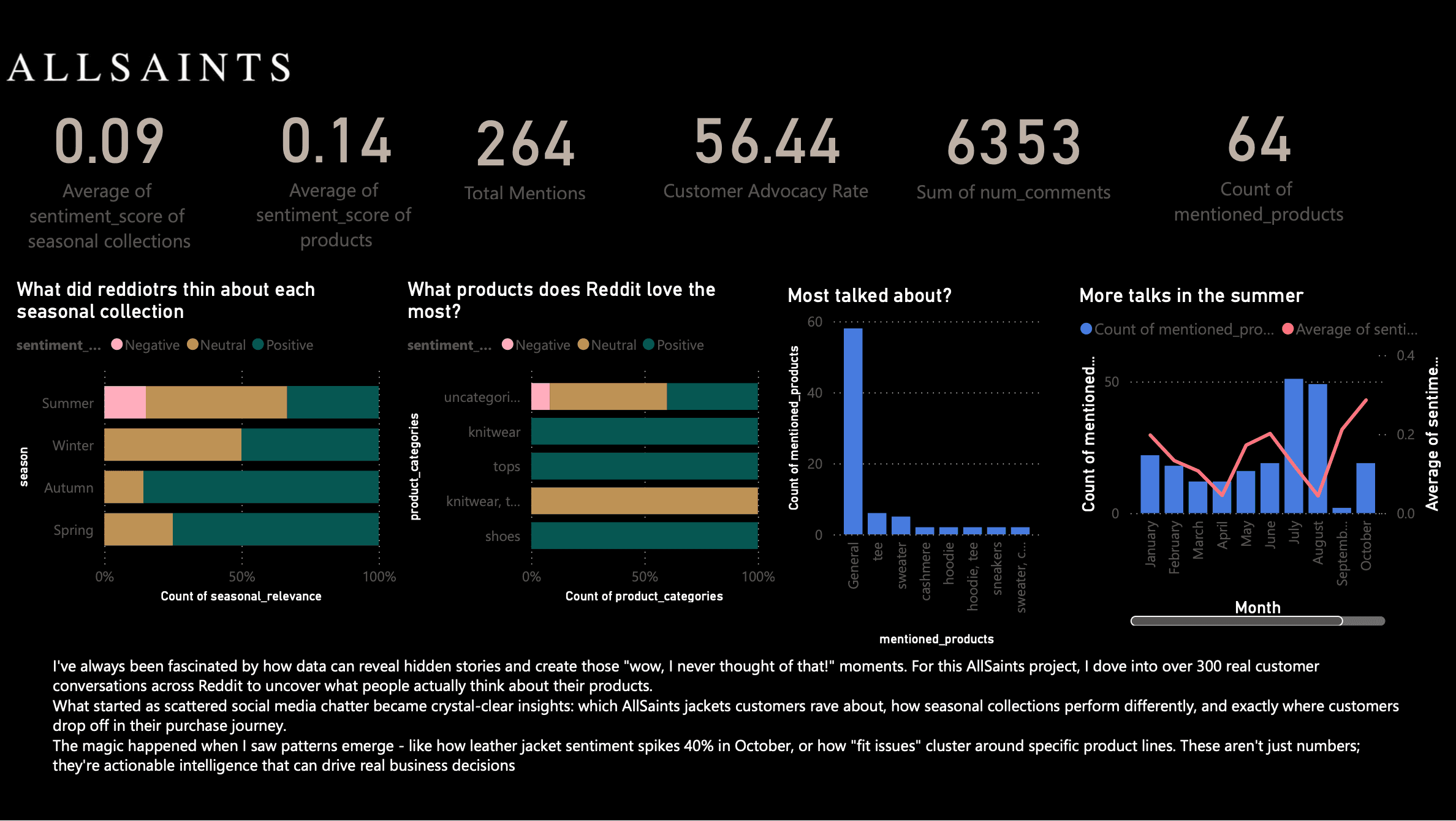Scraped and analysed 300+ real customer conversations across Reddit to surface what people actually think about AllSaints — beyond what surveys capture. Mapped sentiment across seasonal collections, product categories, and purchase journey stages to identify where advocacy is strongest and where friction lives.