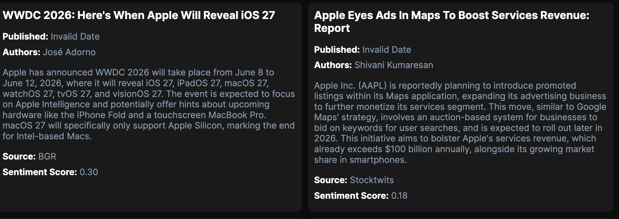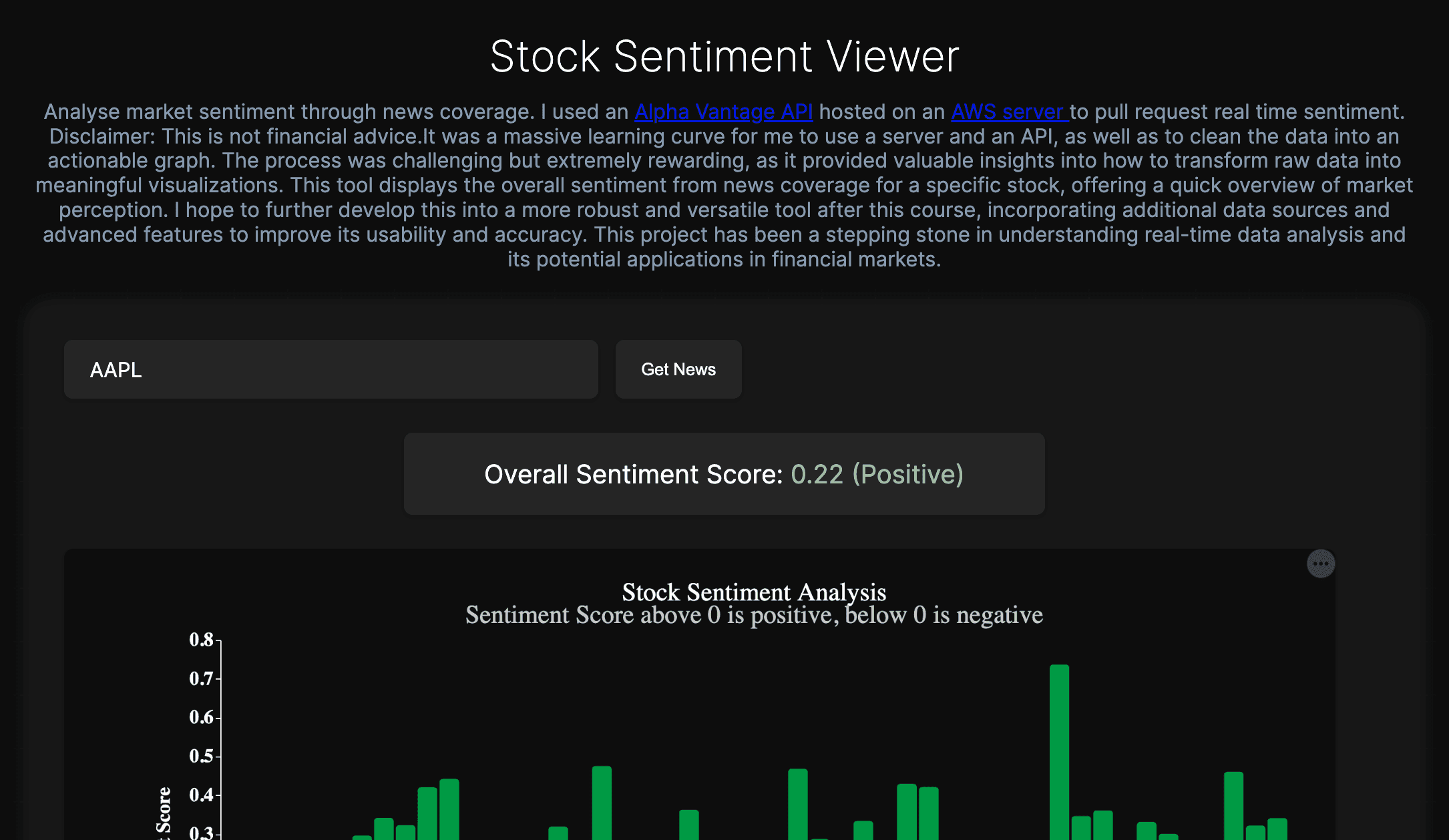 I designed and built a stock sentiment analysis tool, using cloud infrastructure on Amazon Web Services to host and manage the pipeline. This involved extracting, processing, and analysing textual data to generate sentiment signals and visualise market trends.